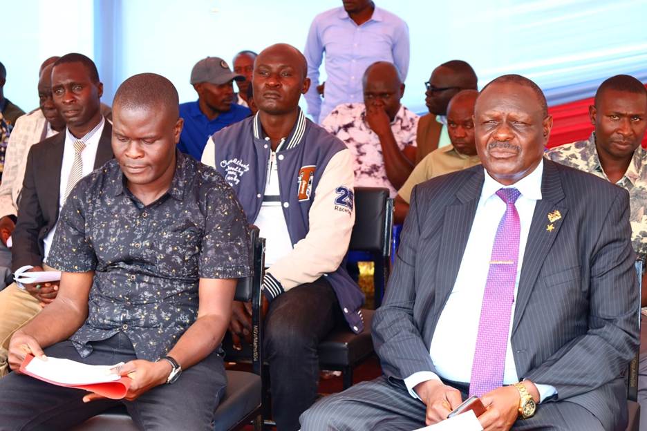Area Member of Parliament Hon. Clement Sloya (left) and Chairman of the Board of Directors, Moi Girls Vokoli High School, Mr. Indimuli Kahi (right), follow proceedings during the public participation forum in Vokoli.