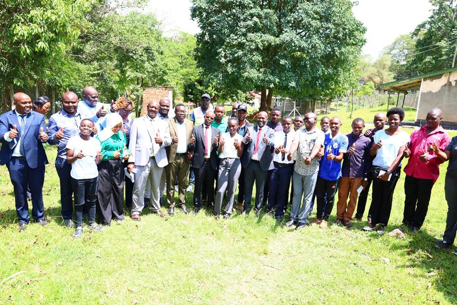 University Management, representatives from the Office of the Member of Parliament, REREC engineers, newly elected student leaders, and local leaders pose for a group photo after the successful site handover for the installation of the High Mast Floodlight at Kaimosi Friends University.