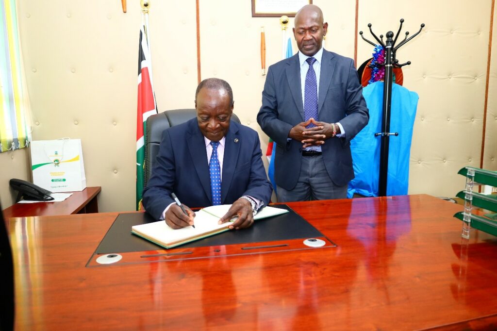 Governor Dr. Wilber Ottichilo signs the KAFU Visitor’s Book after paying a courtesy call to Vice-Chancellor Prof. Peter Mwita, affirming a strong gesture of collaboration between the County Government and the University.