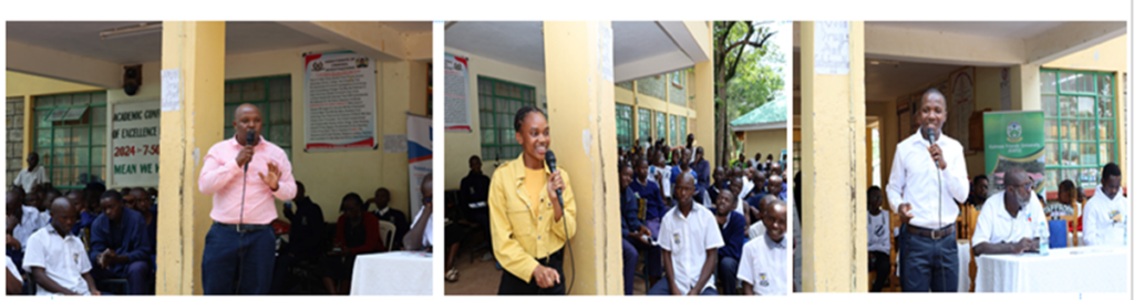 Members of the Kaimosi Friends University – Corporate Affairs addressing students during a career mentorship talk on higher education opportunities and career pathways.