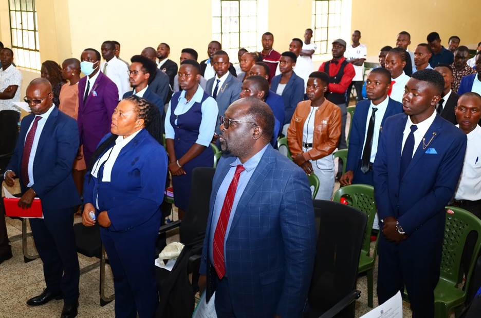 Members of staff, including Deputy Vice-Chancellors Prof. Fred Amimo and Prof. Thomas Kipkurgat, Advocate of the High Court Emily Kadenyi, alongside staff and students, stand in respectful attention during the National Anthem at the University Assembly Hall before the swearing-in ceremony of the 4th KAFUSA Students Governing Council at Kaimosi Friends University.